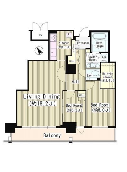 広々とした約18.2帖のリビングダイニングが魅力の2LDK。家族でくつろぐ時間も、一人で過ごす時間も贅沢に楽しめる空間設計です。約8.0帖の主寝室には約2.4帖のウォークインクローゼットを完備し、収納力も抜群。水まわりの家事動線もスマートに整えられています。二面採光の明るいLDとゆとりある間取りが、都心での上質な暮らしを演出します。